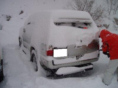おっはりあー群馬丸沼からただいま。温泉でマッタリしすぎたかなー。いやー今日は凄かった。雪の降り方がハンパじゃない。さらに風も強くて気温もすげー低かった。それでも午前中はなんとか滑っていたけど、午後になると状況はさらに悪化していきとても滑れる状況じゃなくなった。視界は絶望的に悪く、見えている景色が全部白くてどこが地面なのか分からなくなり、結果的にバランス感覚がおかしくなってくる。初めての体験。ってことで何か起きる前に終了。危険だよ。車に戻ってみると・・・いつから先輩のサーフはハイルーフになったのですか?日が暮れても一向にやむ気配がない。さすがにもう今は峠を越えたかな?明日の天気は見てないけど、もし晴れなら今シーズンで一番のグッドコンディションだろうな。行く人羨ましいー。