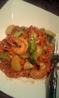 前菜をカンパチのカルバチョと根菜のマリネで一皿にしてもらって、(いつも種類食べたいのでわがまま言ってすいません!)、バスタは手打ちトマト平麺で海老とブロッコリーのソース。海老の香りがよくって、濃厚なソースの味とトマト麺の酸味がいいバランス。