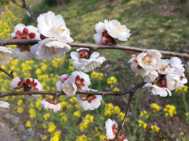 菜の花の黄色と、梅のピンクの対比が