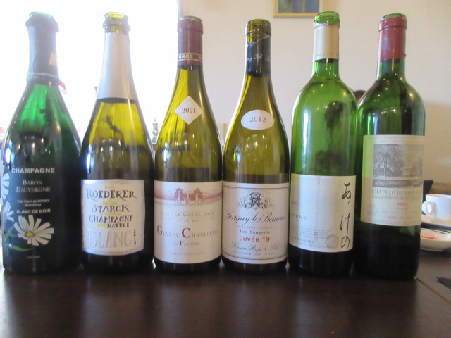 令和5年12月10日浜松市中区鍛治町のプロプルでの、持ち寄りワイン会に参加しました。ワインリスト NV CORBON ANTHRACITE BRUT Yさん NV SECOND SIMON CUVER N Nさん2012 アレクサンドレ ポネトレゾーレ Sさん2020 キュヴェ三澤 Blanc シン2020 ムルソー BENJAMIN LEROUX Sさん2020 ジュヴレイシャンベルタン フィリップ CHARLOPIN Sさん2000 シャルム シャンベルタン アルマン ルソー Fさん2011 Les TOURELLESde ONGUEUILLE Tさん料理ひよこ豆のムース錦爽鶏団子ノルウェーサーモンマリネタコのクスクス鰻写真撮り忘れ 渡り蟹のグラタン写真取り忘れ 宮崎地鶏の赤ワイン煮込み三元豚のグリエエゾシカのソテーヘーゼルナッツのグラッセドライフルーツ料理もワインも美味しくいただきました。