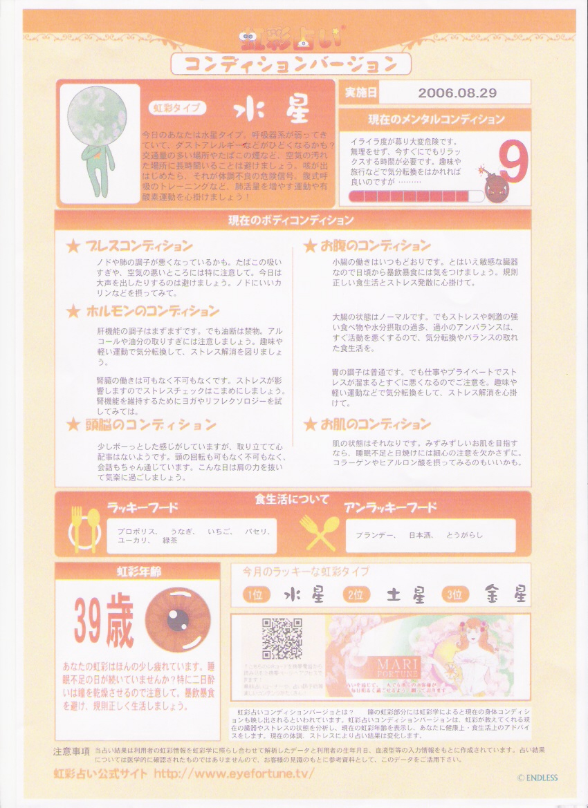 虹彩占い知ってますか?先日 知り合いの石崎さんがイベントでやっているということで、私もやってもらいました。虹彩って何だっけ??と思う方も多いと思います。虹彩とは、一般に瞳と言われる部分のうち、瞳孔を囲む外郭。詳しくはこちら始める前にコンディションバージョン(現在のボディコンディション)キャラバージョン(現在の性格)どちらを占ってもらいたいかを選択します。パソコンを使用し、生年月日や性別等を選択していきます。それから、女性ならわかる方も多いかとと思いますが、肌診断をするときに肌のキメを見る機械のようなものを使用し、目を開けたままパチリと撮ります。それで占い結果が出るのです。私はコンディションバージョンをやってもらいました。結果は・・・現在のメンタルコンディションは・・・10(満点)ストレスが極度に溜まった状態。虹彩年齢は・・・55歳ちょっ、ちょっと待って実年齢はそんなにいってませんからーーー虹彩で占いが出来るなんて面白かったですよこれからイベントなどで見かけたらみなさんもやってみて下さい。虹彩占い↑↑↑↑↑ここ自宅のパソコンからアクセスして出来るものがありますのでやってみてくださいね