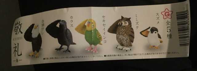 みなさん。ついに敬礼シリーズの鳥特化版でました。ラインナップは以下左からワシ、カラス、セキセイインコ、ミミズクとスズメ。お値段はお手頃の200円。私は2回回したんですが、ワシとみみずくさんが来てくれましたサイズは高さは大体5cm、幅は3〜4cmくらいと意外と大きく。塗装も問題なくクオリティー的には200円という価格帯の割にかなり良いです。←最近のガチャのクオリティーほんとに高いですよね。是非是非お見かけしたら回してみてください。しーやー【コンプリート】 敬礼 -鳥- 【 全5種セット 】価格:800円(税込、送料別) (2021/7/17時点)
