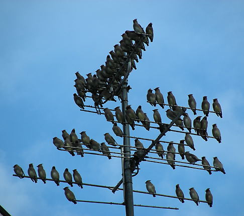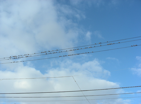 今日も今日とて、見上げたら、見事に連なっているのである。 ただし、今日連なっていたのは、キレンジャーキレンジャクさんではなく、ムクちゃん。 そうそう、この↑写真を撮るときは、Nikon COOLPIX S10 のスイバルデザインがちょこっと活躍したことを付記しておこう。