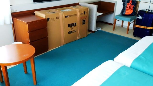 部屋は、ツインの部屋でしたのでロードバイクを組み立てるのには充分な広さです。ロードバイクも部