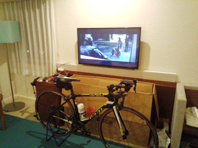 ホテルの部屋は充分に広いのでロードバイクもこんな感じで格納し、明日の本番に備えます。