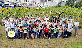 「スマイルとうほくプロジェクト」(岩手日報社など主催)は29日、陸前高田市横田町の花畑で記念撮影を行った。スマイルマークの形に植えたヒマワリが満開となり、子どもたちの笑顔も咲き広がった。戸羽太市長、横田保育園(新沼京子園長、園児59人)の年長組、地元住民、花畑の近くに宿舎がある建設会社の作業員ら約50人が参加し、写真に納まった。 背丈を上回るほど成長したヒマワリに園児は大はしゃぎ。安田光朗(みつあき)ちゃん(5)は「こんなにいっぱい咲くなんてびっくりした。きれい」と喜んだ。ひまわりは見る人を笑顔にしてくれますね!来年の夏も咲いて欲しいです!!