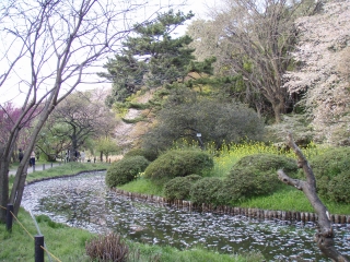 池の向こう岸には、黄色い菜の花とスイセンが咲いていました
