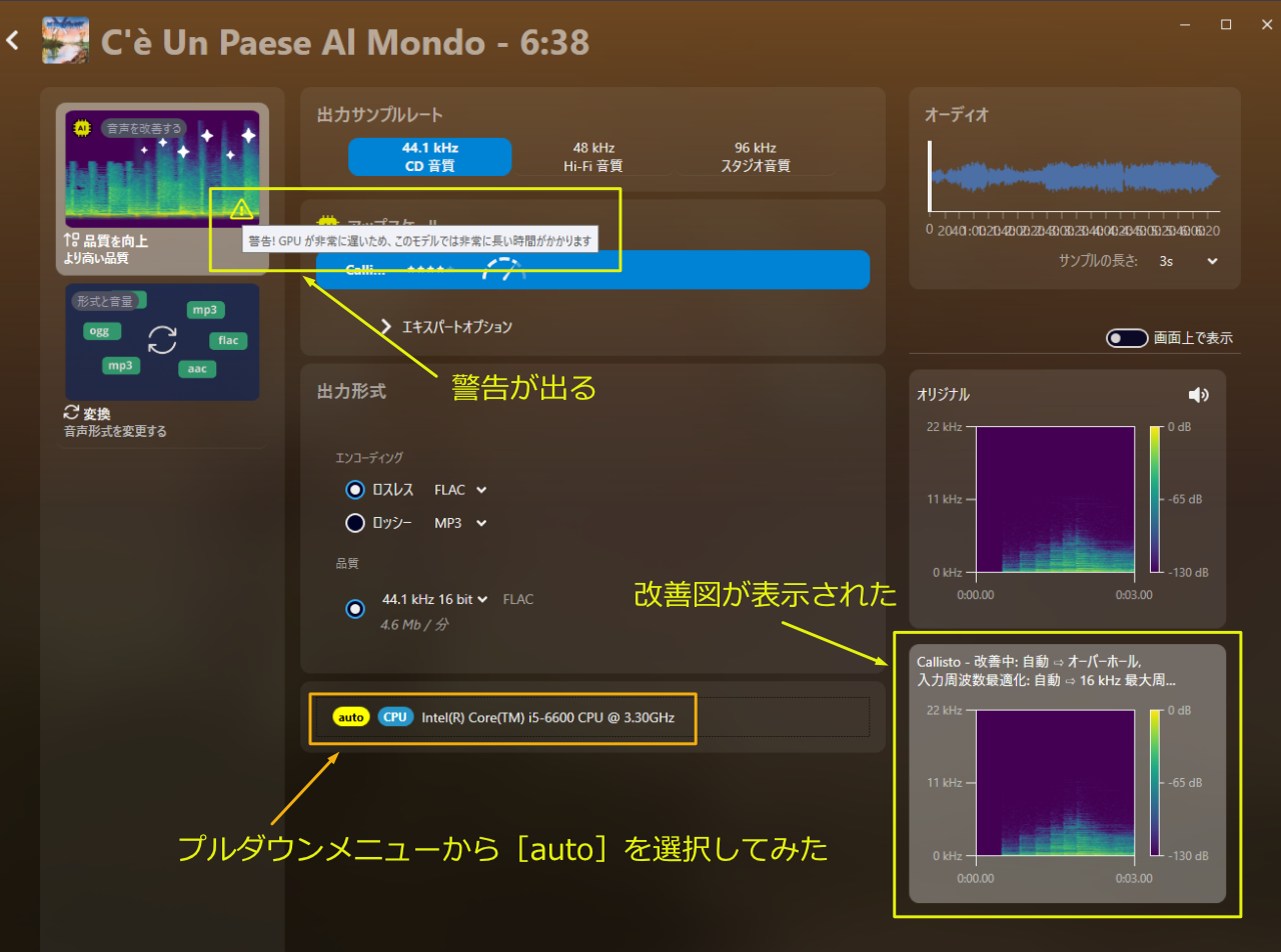 | 低解像度/短時間の動画を高速な AI 改善モデル(Vega、Polaris、Antaresなど)で処理する場合(低性能 GPU) | Nvidia GTX 1050-Ti, Nvidia GTX 1650, NvidiaGTX 970, AMD RX 570, Intel HD 520 (Mobile Skylake), Intel HD 620 (Mobile KabyLake), Intel UHD Graphics 620 (Mobile Kaby Lake R), Intel Iris Xe, Nvidia GTX960, Intel HD 4600 (Desktop 1.25 GHz) |