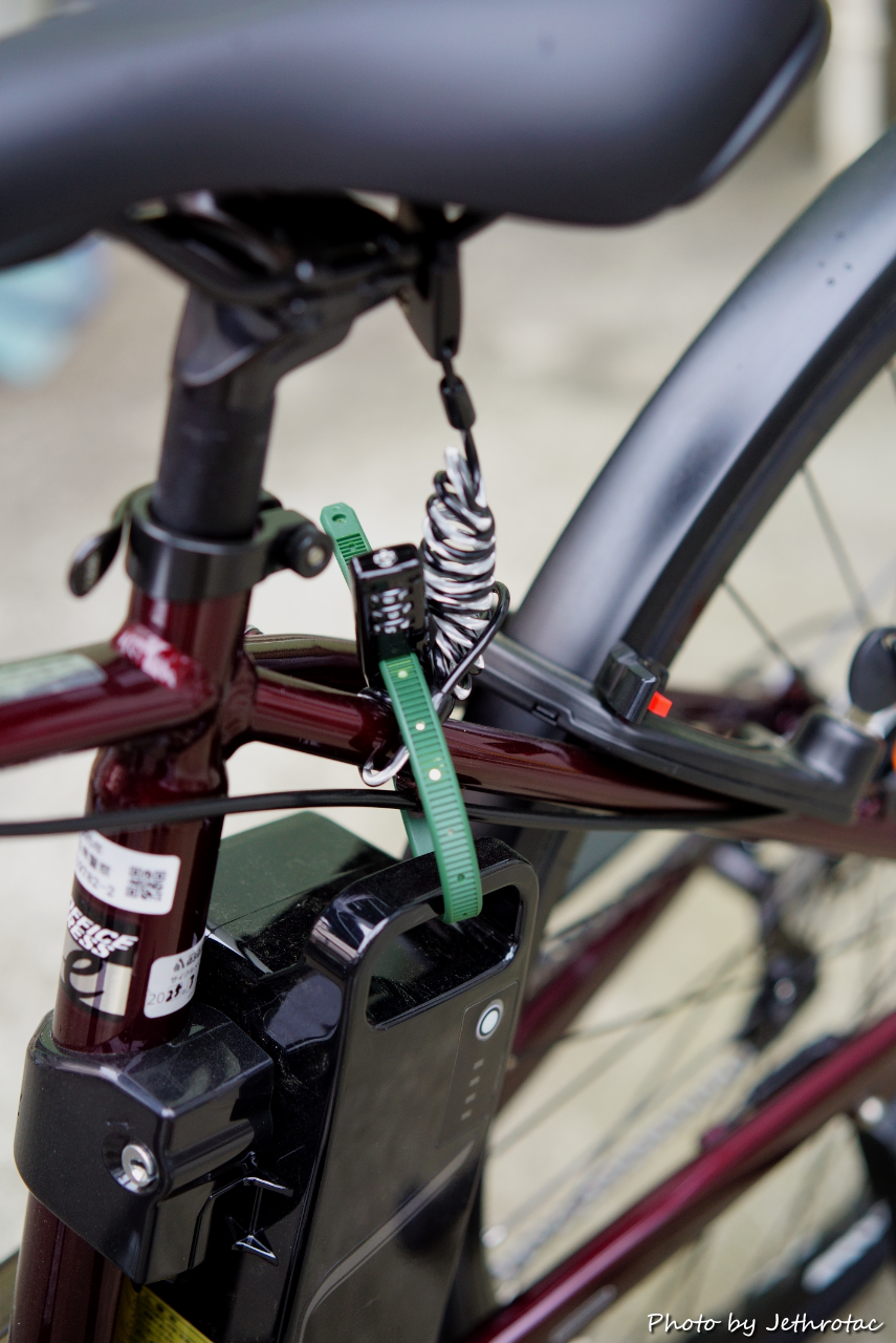 お店でつけてもらった盗難防止のためのサドルロックと事前に用意したバッテリーロック。特にこのバッテリーロックは遊びをなくすことができ&付け外しも楽ちんのスグレモノ。