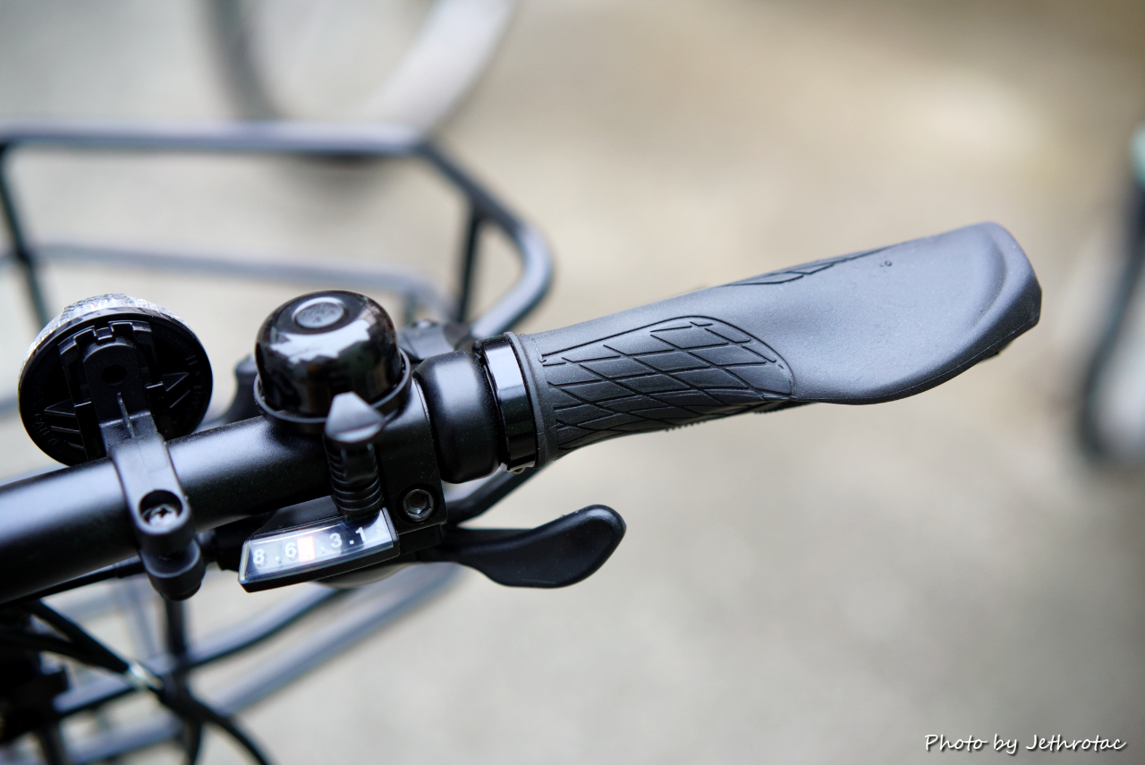 驚いたのがこのグリップ、変な形だなあと思っていたのですが乗ってみるとこの出っ張りがうま~く 前かがみになりその重心がかかる手の部分に当たり優しく受け止めてくれるんですよねえ...良くできてます、これなら冬場以外手袋などは不要かな^^。