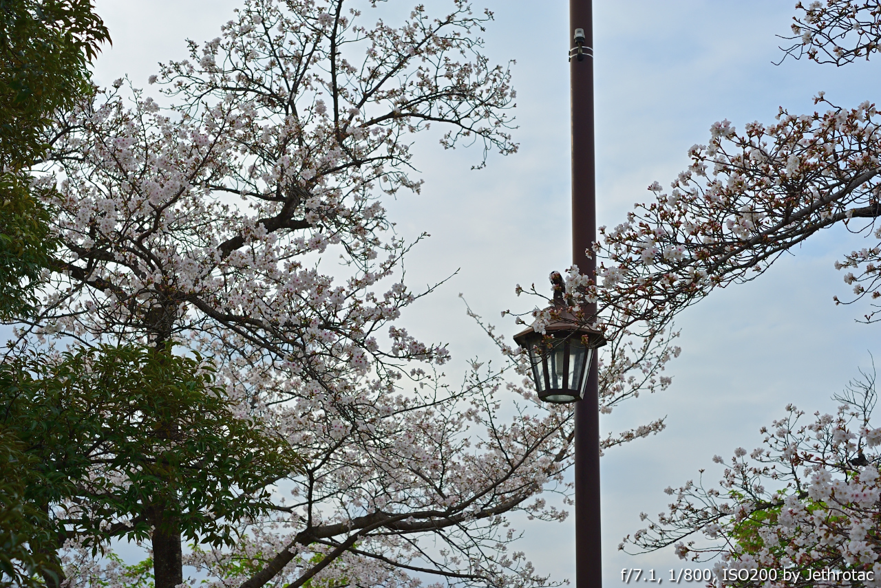 今回現像していて感心したのがこの一枚...背景の多くが半逆光くらいの空でしたので桜が暗くならないようプラス補正でシャッター切ったので空はほぼ真っ白でしたが、ピントピークのおしゃれな街灯も含めなんとか桜の色も出ており加えて空の青がしっかり出てきてくれてビックリです。​