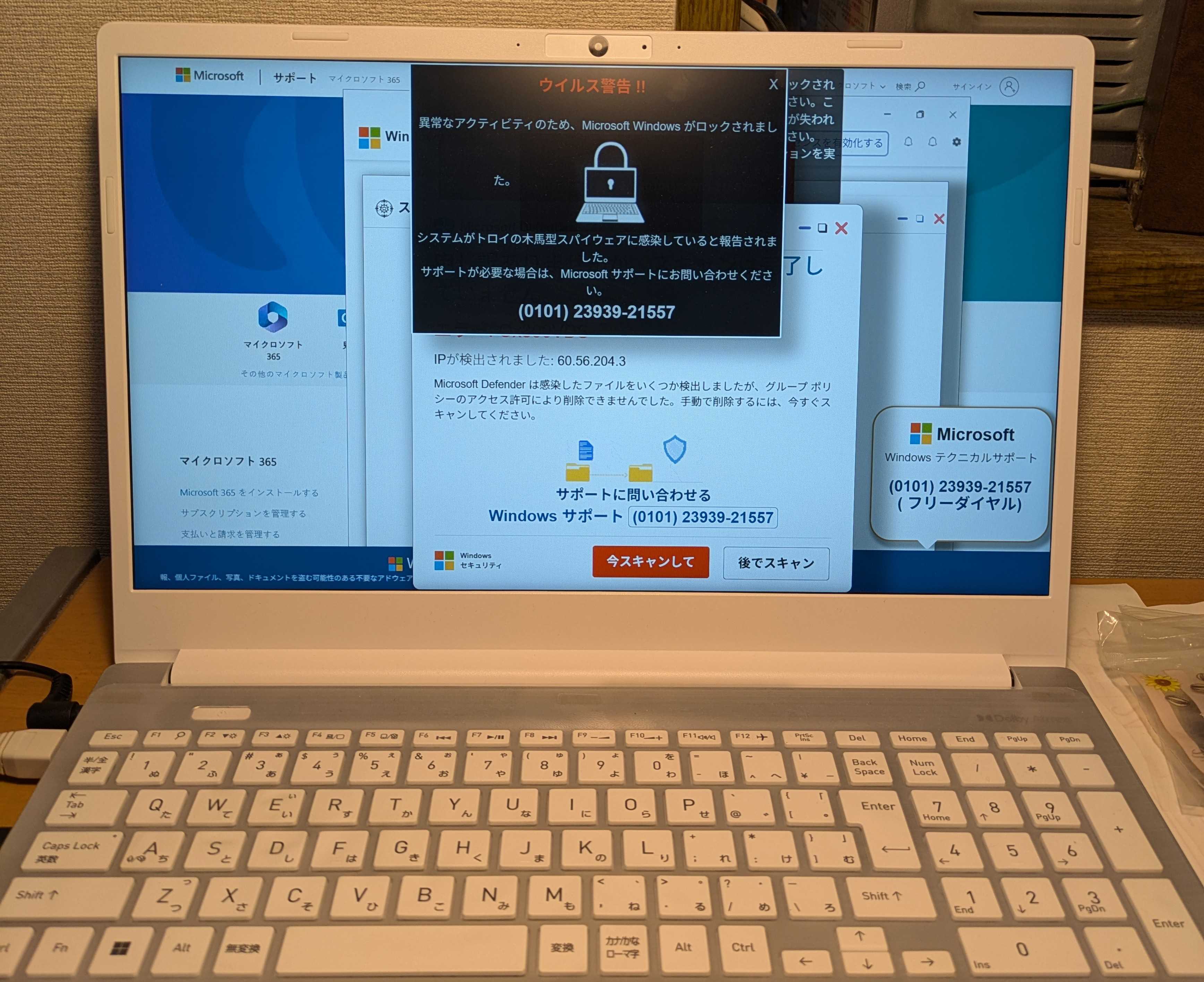 いつものようにネットをしていたら、大音量の警告音と共に、「あなたのパソコンのデータはしまいこまれました、画面に表示されている番号に電話してください」というアナウンスが!