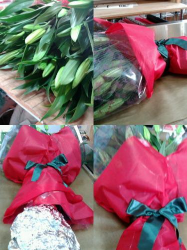 お誕生日の御祝いに花束ご注文いただきました。カサブランカの花束です。かなりデカイ!失礼しました!!かなりビッグで、かなり重い!!!ただ、お花が新しすぎてつぼみばかり・・・。新鮮さは抜群なのですが、カサブランカらしさというか、花束らしさにかけるような・・。長持ちは絶対、保証します。