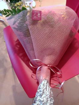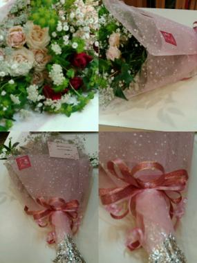花束は花はもちろんだけどラッピングやリボン選びも重要なポイント!!用途に合わせて選んでいます Jフラワーの最近のお気に入りはこのラメネット☆ブーケ風に仕上げて欲しいというお客様が最近増えています♪