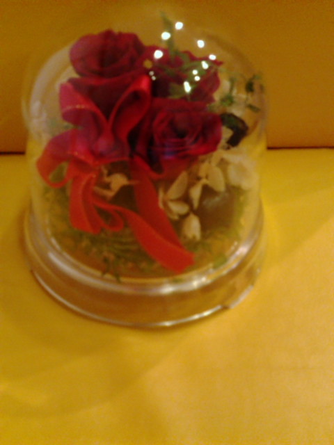 ドームの中に納めるのは以外と難しかったよ。リボンの大きさもかなり小さめに作ったけどそれでも大きく感じます。やっぱり、エネルギーが凝縮されて表現されるからでしょうね。実大より大きく感じられます。バレンタインを意識して、チョコもちょっこと入っています!!みえますかぁ??