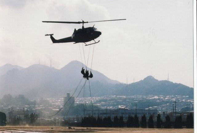 さて、パレードも終わり、最後は訓練展示です。要するに模擬戦を行います。ストーリーは、某所に某國軍が侵入しこれを自衛隊が撃退するという筋書きです。某國軍は、陣地を構えているという情報が入って、先ず偵察隊が出動したものの軽微な反撃を受けます。次にレンジャーが先遣隊として出撃。ヘリから降下します。やがて155ミリ榴弾砲が布陣し、砲撃開始。全身迷彩の狙撃兵も出撃。更に74式戦車も肉薄攻撃。空からは攻撃ヘリが銃弾の嵐。(これは攻撃終了後)残敵は火炎放射機で丸焼け・・・・・・自衛隊の効果的な反撃に、侵略某國軍は殲滅されてしまいます。メデタシメデタシそれにしても、弱小な侵略軍に対して、まるで袋叩きのような圧倒的な反撃でした。侵略軍は制空権も無く、これでは大東亜戦争時に、ガダルカナル島のヘンダーソン飛行場に無謀な突撃を敢行した一木支隊のような感じです。因みに写真が「中略」となっているのはフィルム装填に時間がかかったので・・・・・。毎年、趣向を凝らした演出で楽しませて貰っています。