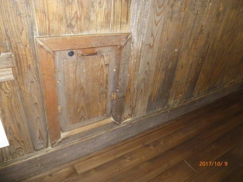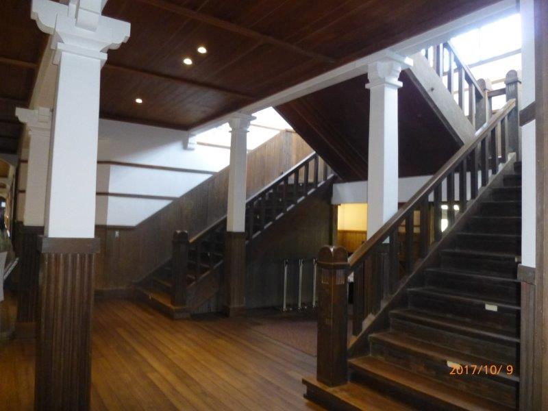 ダストシュート真鍮製ですね。拙者の居た頃には既にスチール製の椅子と机だったような気がする。廊下の床も張替済み。窓等の建具も大半が木製ながら更新された模様。このアルミ食器には見覚えがある。一部に天井を外して小屋裏が見られるようにした部分がある。意外に洋小屋。 トラスが組まれている。 接合もボルトとナットを使用。そういえば、屋根瓦も和風ではなく洋瓦だった。会議室校長室