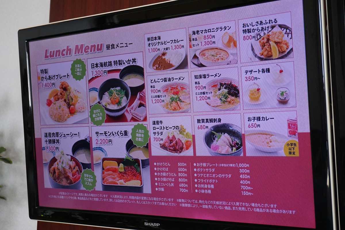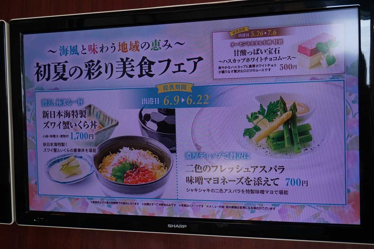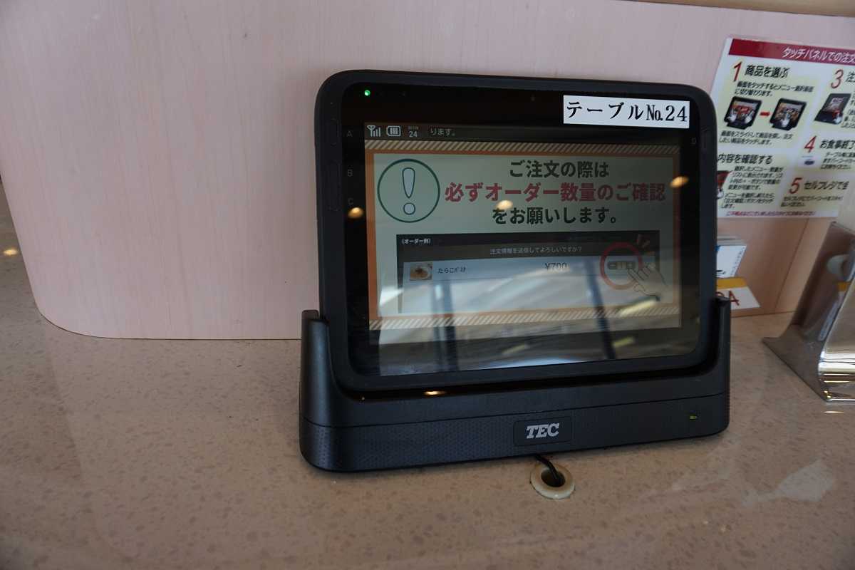 昼になったので、レストランへ。 昼食の営業時間は1200~1300の1時間しかないので、皆様ぞろぞろ集まって来る。 オーダーはタブレットで行う。 清算は食後、各テーブルに置いてるバーコードが記載されたカードを精算機に翳して支払う。
