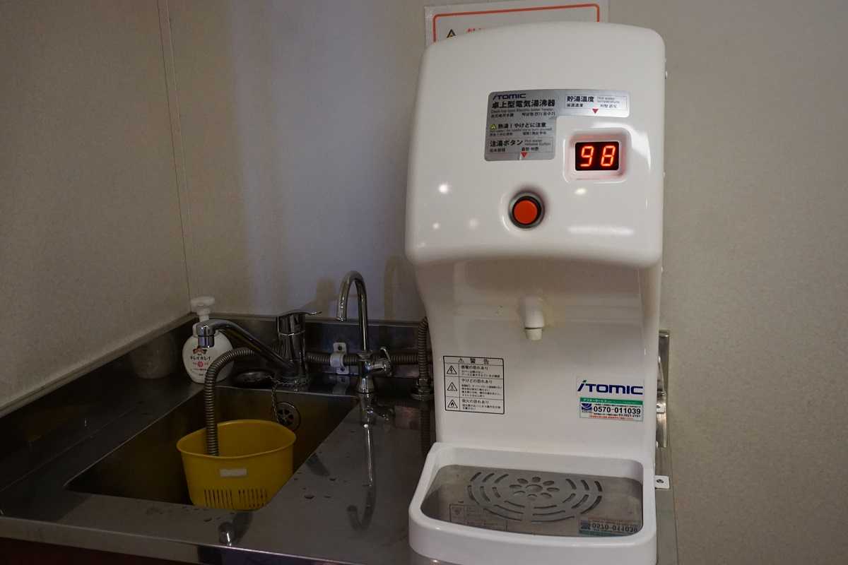右は給湯器。食べ残しの汁は左の流しのカゴ内に捨てる。