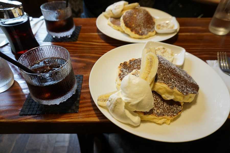 最初、パンケーキと聞いて、マクドナルドのホットケーキのようなものだと特に期待していなかったが、食べて愕然! 一体、どうやって焼いたのかと思わせる、とろけるような、フワフワのパンケーキに、バナナと生クリームが載っていてバターも添えられている。  アイスコーヒーも美味であった。 大満足。