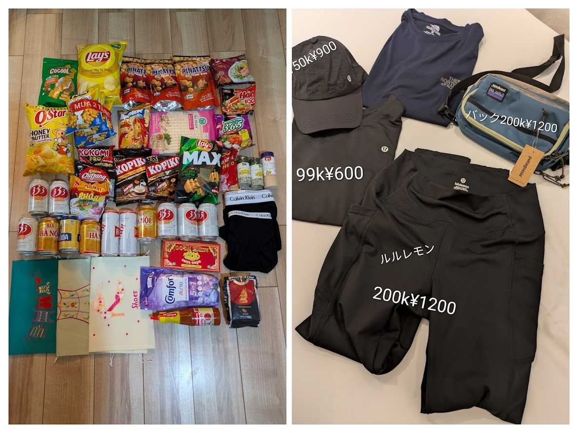 前回帰ってきたときに、夫とどうしてもっと買ってこなかったんだろう・・・と。今回は絶対、たくさん買おう!!!と勇んで行きました。夫はノースフェイスのTシャツとボディバッグ私はランニング用のタイツとTシャツ現地に言ったら今回はカナダでヨガしたときに、みなさんが着ていた「ルルレモン」があちこちに!私は「全部ルルレモンで揃える~~~!」今回両替は日本円で¥15000ホテルとグラブ以外はすべて現金これだけ買って、その他現地でビアバーや中華、飲み食い、空港往復のバス代も含め、¥15000でちょっと余ったほど写真のほかに夫の○○クラインのトランクス3枚やノースのTシャツも他1枚ベトナムのビールはどれもおいしいです。ベトナムの物価、楽しすぎる~~~!!!来年は絶対ダナンリベンジしたいです。にほんブログ村にほんブログ村 にほんブログ村にほんブログ村 にほんブログ村楽天リーベイツ経由だと1%ポイントももらえますよ~登録してない方は↓から、ヨロシクです。500ポイントもらえます