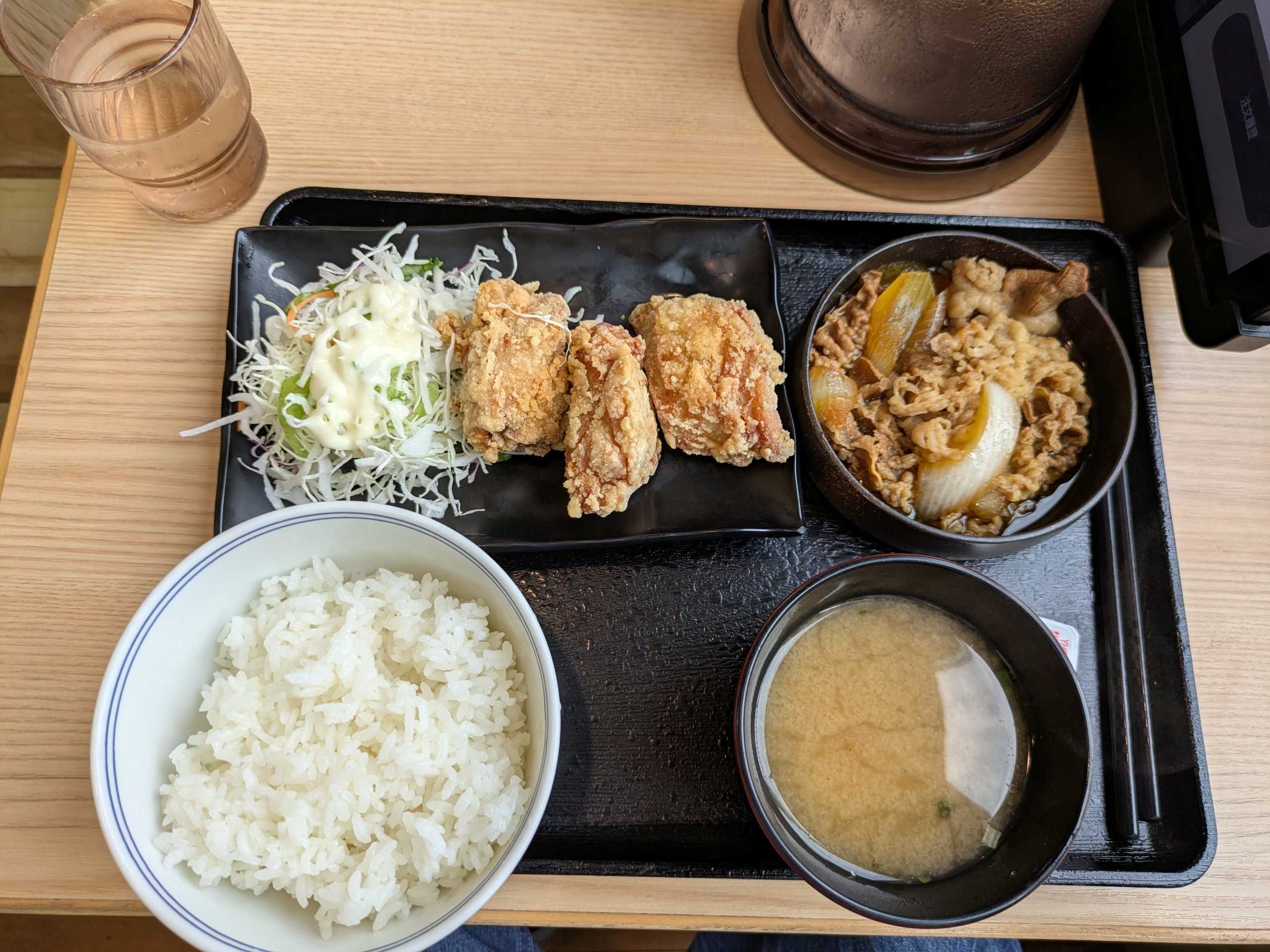 黄色い帽子の店で子供の車にドライブレコーダー付けて、その後吉野家さんに向かったずっと前は駅前にあって、何度かいってたけど、閉店してからはご無沙汰ロードサイド店は初めてかな子供は牛丼大盛、私は牛皿・から揚げ定食を頼んだタッチパネルで頼んで、店員さんがもってきてくれるスタイル人出がやや足りてなくて、詰まっている感じ隣の爺さん婆さんたちは、タッチパネルが使えなくて店員さんを呼んで注文ちょっとしたら店員さん呼んで、注文変更してて、人手足りてないんだってで来たのがこれドレッシングはテーブルに置いてなくて、ぱかっと割るタイプのマヨネーズが付いていた(みそ汁に隠れている)牛皿は松屋さんのとはだいぶ違って、玉ねぎ大きめで量多めこれはこれで好きから揚げは、味がハッキリ付いていて、これこれこれ、という感じ美味しく頂きましたそれでは、明日も元気にブログを書けますように