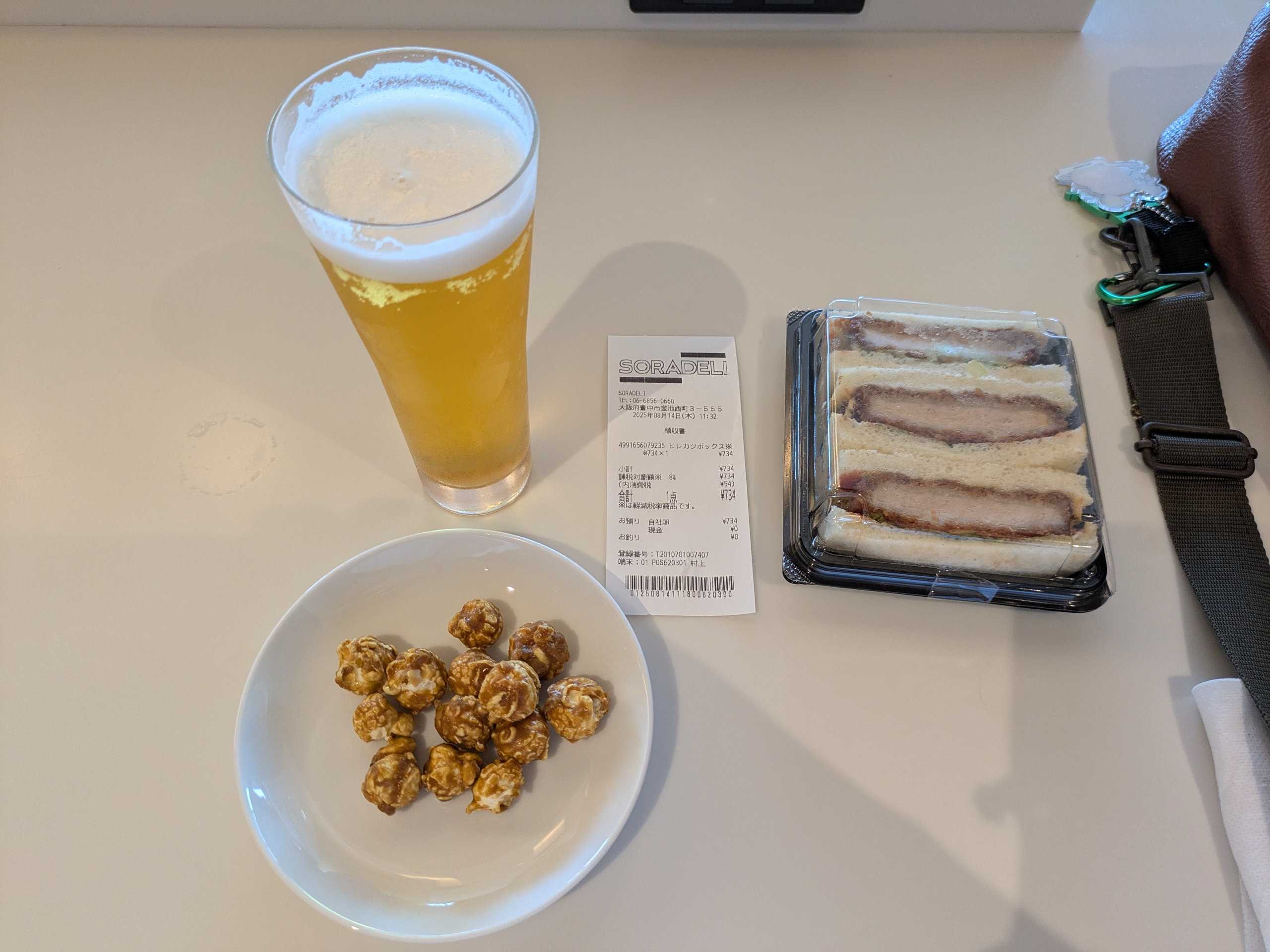 ラウンジ入る前に買ったカツサンドと、ラウンジの無料塩(?)ポップコーンとスーパードライ