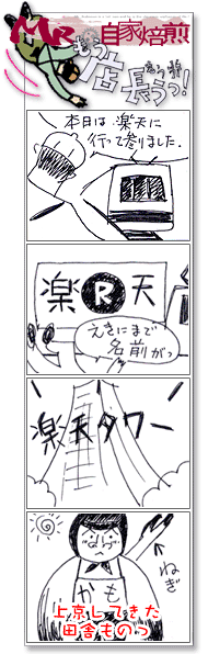 こんにちは!熱い店長の熱い妻?こと、熱ママです。楽天市場戦略共有:コーチング編店長、楽大組織に立ち向かう挑む、第3号もお楽しみに~ To Be Continued当店の楽天担当EC「ぐっさん」は、まだまだ、楽天菌(どんな?)に侵されていないどこか純(本当かな?)な所が残っている青年~でも~しっかりと、経営戦略は、ばっちり《マニュアルどおり》練られておりましてまさに、カモねぎ でも、それを承知で『上京しております』今年も、楽天担当EC「ぐっさん」の上げたハドールを超えてお客様、皆々様に、う~んと楽しんでいただける「三方良し」で、がんばります~。では、いよいよ、楽天の巨塔に挑み、大きな組織に立ち向かう熱い4コマ漫画、次回もお楽しみに。