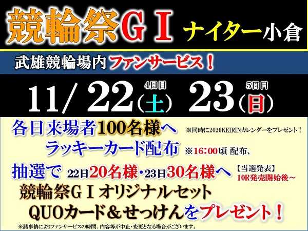 ウィンクそして、武雄競輪場 場内では、 【11/22( )・23( )】 競輪祭GⅠナイターの3日目、4日目に2つファンサービスを実施致しますよ。