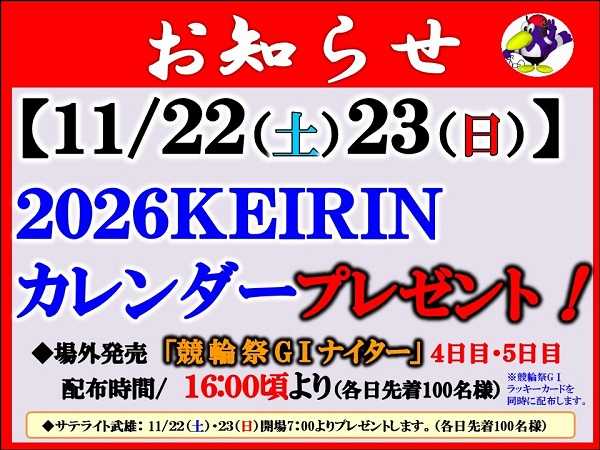 ぺろりそして、 サテライト武雄 では同じく11/22(土)・23(日)の朝7:00より各日先着100名様へ2026KEIRINカレンダーをプレゼントしますよ。(※ラッキーカード抽選会は武雄競輪場のみです)