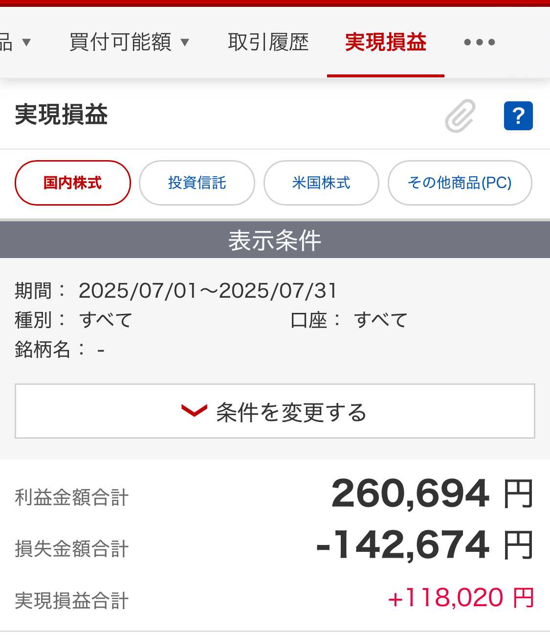 早速ですが7月の結果は+118,020円でした今月はプライベートで色々ありまして取引回数がいつもより少ないんですが7月後半はとりあえず思考停止してました前半で良品計画と楽天銀行で合わせて−12万ほど残りの2万は小さいので無数にやられてます湖北工業をもう少し上手に手放せてたら…さらに4万くらいはプラスにできたかもなのになぁ…旦那から後悔ばっかりやなと言われましたがそんなことないですようまく行ったことは旦那に話してないので後悔ばかりなら株やめてる😂後悔じゃなくて、反省やー!!