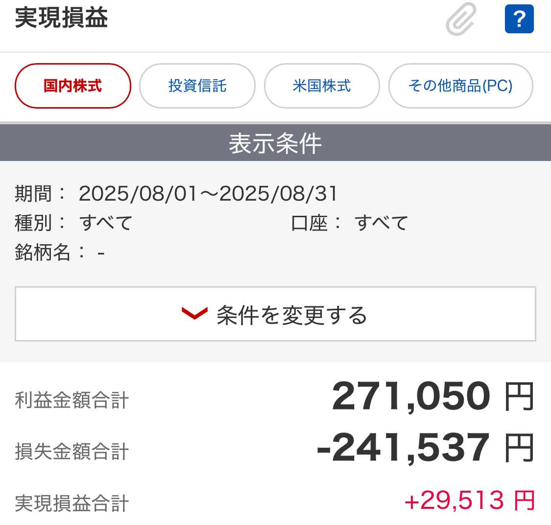 8月も日本株、振り返ればすごい上がってましたね私は8月頭に含み損を損切りしちゃいました…めちゃ後悔することになります最終的には8月もなんとかプラスで終わりました+29,513円7月に購入し、見事に下がり続けたサンリオで−11万良品計画で−4万楽天銀行で−3万上の3つを8月頭に損切りしましたサンリオは上がるという自信があったので信用で300買ってましたが100だけ損切りして200を現引しました100だけでマイナス11万😂どんだけ高値でって感じですよね〜まぁ、このあと損切りした3つともめちゃくちゃ上げたので損切りする必要なかったですねあくまで結果論ですが…なんかトランプさんのこともあるし利上げやなんやかんやと私にとっては株式市場で初めて迎える環境だったり急に日本株上がり出して怖かったりいつ暴落が来るか分からないなと思ってたので損切りはできるようになったというのはよかったかなサンリオはその後の爆上げで9万はとりかえしましたし暴落が怖くていくつか持ち株を利確したのもあります楽天グループで+15,000円サンリオで+90,000万楽天銀行のスイングで+70,000円ずっと持ってるファーストアカウントを100だけ手放し+30,000円あとはデイトレというか…今となってはスキャルティング??で約10万プラスになってるようです損切りは大事というけれど上がるという自信しかなかった私は100株だけでー11万と大きなマイナスを出しましたみなさんもお気をつけて!