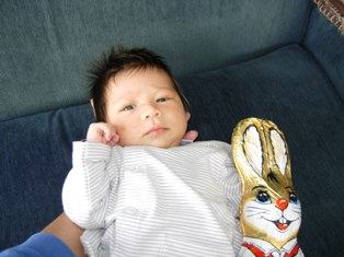 そういや、19日から26日まで、ヤツ父が、オーストラリアから田舎国に来てました。初孫見たさに、ウホウホやって来ました(笑)ま、こんなことがないかぎり、ヤツ父が田舎国に来ることなんてないだろうしね(汗)で、1週間我が家に滞在してたんですけどね。。(そのうちの2泊は、ヤツの異母妹(父にとったら娘) のところに滞在したのですが。。。)疲れたけど、楽しかった!!ヤツ父、若すぎる!!!ま、年も若いけどさ、気が若すぎる!!ヤツの方が兄貴に見えるよ(笑)初日は親子で宴会!!もちろんウォッカをショットで(汗)で、ヤツ父、台所とトイレで吐く!!!!(汗)他人に家を汚されるのが嫌いな私。。。ちょ~~~ブルーになりました。。。(汗)が、ヤツは父にとてもよく似ていて、顔も似てるけど(体形は似てない)感覚というかセンスというか、笑いのツボとかそういうのがそっくりで、とにかく話が盛り上がって楽しかったみたい。小さい時に離れ離れになってから、あまり良い関係じゃなかったけど、ヤツいわく、「今回一番身近に感じれた。 今までで一番良い関係になれた」と、いうぐらい、ヤツ自身も楽しんだみたいです。。。で、ミジンコちゃんですが、しらんおっさんに抱っこされて、ビデオ撮られて、少々とまどってましたが、泣きもせず、ぼ~~~とされるがままになってました(汗)またそのET顔っぷりが笑ける!!(笑)ヤツ父からは、たくさんおみやげをもらって、抱っこ紐やら、泣き声が遠くにいても聞こえるトランシーバー?やら、お小遣いやら、ペンダントやら、シャンペーンやら、とにかくヤツ父、どうもありがとう!!!(私的には、お小遣い(現金)が、一番うれしかったりして、、)一応イースターということで、エッグ&バニーのチョコと一緒に写真とってみました。。本人は、かーなーり嫌そうでしたが、、、(汗)もちろん、このあと、このどでかいチョコたちはすべて、誰かさんがたいらげました(汗)↓ あと、そういや、私とミジンコちゃんの写真って、 生んだ直後の2枚以外無い!!ということに気づいて、 撮ってみました。。。 剛毛親子。。。。今年も楽しいイースターになりました♪