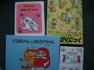 先日、うちの家から徒歩15分ほど先のアパートに住む日本人家族が、日本に帰国する為、食器やらおもちゃやら、いろいろガレージセールをしていたので、行ってきました!アパートには、子供たちがたーくさん!!日本人の子、ハーフの子。みんなかわいい♪でも、やっぱり、白人とのハーフの子って、すぐわかりますね。髪の毛茶色いし、顔立ちがはっきりしてるし。。。うちのミジンコちゃん、やっぱりアジアンな顔してます。それに、あんな髪の毛の多い赤ちゃん、いませんでしたね!!!!ミジンコちゃんよ、あんた、やっぱ特殊だよ。。その髪の毛の量(汗)変なところが似てしまって。。。ご、、ごめんよ。。ミジンコちゃん。。。もう剛毛母子、決定的だわね。。。。あなたのハーフヨーロピアンの血は、どこへいったの?ま、それはさておき、絵本、ママはGETしてきましたよ!!これ↓みーんな、私が子供のころ、大好きだった本ばかり!!!なつかし~~~~♪ぐりとぐら。ノンタンシリーズ(特に写真の「おねしょでしょん」が大好きでした)だるまちゃんとかみなりちゃん(かみなりちゃんのおせんべいがかわいいの♪)14ひきねずみ家族シリーズ(絵がとってもかわいいの)その他数冊。合計10冊GET!!&ミッフィーのぬいぐるみもGET!!うちの母は、絵本の読み聞かせが大好きで、たくさんの絵本や紙芝居を読んでくれました。そして、それが効してか?図書館から委託されて、自宅で「なかよし文庫」なる、なんちゃって図書館を開いてました。もう、20年以上たつんですよね。。。なつかしいなぁ。。。私が子供のころ大好きだった絵本が、ミジンコちゃんも読むことができるなんて、感動です♪そして肝心のミジンコちゃんは、、、、、読み聞かせしている間、ちゃ~~~んと絵本見てくれましたよ!!!!生後2ヶ月で、絵本デビュ~~~♪その母子の姿にしっとしたヤツ。さっそくYOUTUBEで母国のアニメ「みつばちマーヤ」を検索し、ミジンコちゃんに見せてました。が、、、無視!!!(爆)ヤツ、がっかり!!!(笑)ちょっと、まだアニメは早いんじゃない??もう少し大きくなったら、パパと一緒に見れるようになると思うよ!ヤツ、もう少しの辛抱だ!!(笑)が、どうしてもミジンコちゃんといちゃいちゃしたいヤツは、あきらめきれないのか、なんとか母国から絵本を取り寄せられないか、ずーっと考え込んでました。。。。。誰かに頼めればいいんだけどね。。。あの変態母に頼んだら、10年後ぐらいになりそうだしね(汗)
