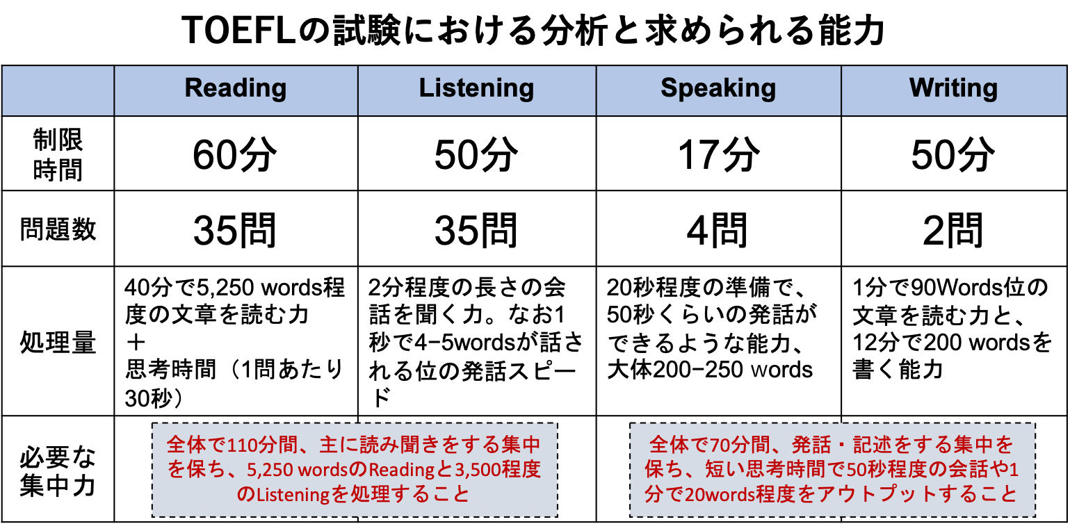 TOEFL iBT100 点以上を取るためにどのような能力が必要で、自分の能力とどれだけ乖離があるかを考えるために、以下のような分析をしました(実際は単語力や文法に関する分析もあるので、もう少し複雑な分析を行いますが)。