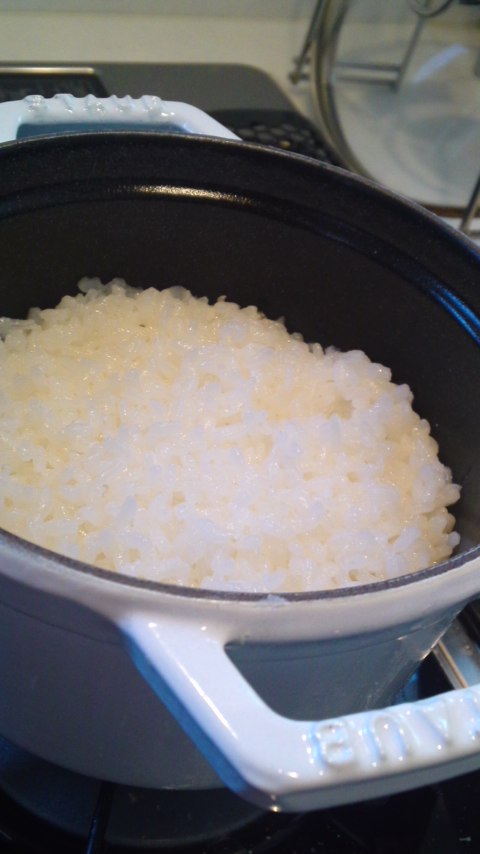 14cmの白いラウンドココット。ちょうど1合炊けます。我が家は夫と二人で1回に1合。カレーの時とかはもっと食べますけどね。 で、ガスで炊いたご飯はおいしいっていうし最近チャレンジ始めました。 一応参考にしている本はあるのですがその通りだとなかなかうまくいかず。まぁ、無洗米なのもありますかね。 最初は無洗米用のカップに1杯のお米に200mlで(浸水なし)蓋をして中火で沸騰するまで、沸騰したら9分ごく弱火で、その後10分蒸らす。 て感じでやってみたのですが、鍋の真ん中あたりはちょうどいいけど他は硬い! 次に水を220mlにして、浸水30分以上してからあとは↑と同じように炊いてみました。ほどよく炊けたけど、なべ底のごはんが硬い!こげて硬いんじゃなくて、芯が残っている硬さ。 それを解消すべく、次は水220mlで浸水させて蓋をあけた状態で火をつけて沸騰したらお米をぐるぐる混ぜて~。蓋をしてごく弱火で8分。蒸らして完成。ん~。前よりいいけどやっぱりなべ底のごはんが硬くて食べられない。 てことで蓋をしてからの加熱時間を7分にしてみました。かつ、沸騰する前にもぐるぐる~。炊きあがりは… わかりにくいですが、今までで一番うまく炊けました。ほどよい硬さのごはん。鍋底のごはんも、やや硬いけど芯は残らずちゃんとたべられます。最後に強火でおこげつけたりするとさらにいいのかな~☆ ちなみに、炊いた後のお鍋はこんな感じ。鍋底のごはんはきれいにとれるんですがごはんをとるときに熱い鍋肌にくっつくごはんはとりきれずに残ってしまう感じ。でもごはん食べてる間にお湯につけておけば簡単にスルッととれます。 ちなみにだんなサマの感想は・・・最初、「うん、炊飯器で炊くのと同じ感じ!」え゛(@_@;)失敗した硬いごはんを食べさせられてたせいもありますが。で、「そうなの~?じゃぁ、炊飯器の方が楽だから鍋で炊くのやめようかなぁ」って言ったらまた一口食べて、「こっちの方がごはんがみずみずしい。あと甘い。」だって。どうしようかなぁ(-"-)