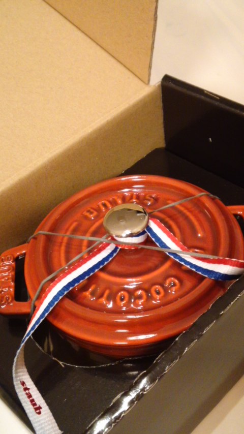 うちで使ってる琺瑯のお鍋。至ってフツー。もらいもの?なのかな。だんなサマの持参品。見た目は…残念ながら私の趣味じゃないなぁ(-_-;)でもとりあえず使い続けて4~5年?愛着の持てるお鍋が欲しいなぁと思い始めてルクルーゼをちょちょっと調べてみたらストウブ。どうやら焼き付けもできるらしい。そして、お鍋の内側が黒いらしい。色移り気にしなくてよさそう♪てことでストウブ熱が上昇中~。何色がいいかな~サイズはどうしようかな~と色々悩むのがまた楽しい。そして近くのアウトレットにツヴァイリングがあると知り、この間ちょっと行ってきました。裏道使って自宅から15分。いい距離ですね♪気になっていた色とサイズの確認。迷っていたのはチェリー?グレナディン?サイズも22にしようか24にしようか?写真じゃ明るく写ってたり暗く写ってたり写真ごとに違ってわかりにくかったので実際に見れて良かった!私の好みはグレナディンでした(*^_^*)でも、店員さんに聞いてみたら、このアウトレットにグレナディンのラウンド24は一度も入ってきたことがないとか(・_・;)やっぱり人気なのかな?煮込みに使うとなるといっぱい作ることが多いから22よりは24がいいなぁ…で、店内をウロウロしてたら。見つけちゃった☆高島屋限定色のローズレッド。グレナディンより明るい感じ。やっぱり24はなかったけど…私が気になったのはミニサイズのラウンドココット。かっ、かわいいっ。B品扱いで40%オフ。店員さんに言ったら在庫を出してきてくれて箱から出して選ばせてくれました。在庫は展示含めて4つ。1つはちょっと大きめの気泡が入ってるからパス。もう一つは取っ手部分に傷が。あとの二つは蓋の側面のところの色ムラ。あと本体に針の先くらいの気泡がひとつ。調理に関係ないよね・・?色ムラは言われなかったら気づいてなかったし。そして「限定品だからいつまであるかわからないですよ~」by店員さんち~ん♪お買い上げです(笑)てことで我が家にやってきたストウブちゃん♪まさか初ストウブが10cmのミニココット×2になろうとは(^_^;)でもこれ、一人分のもの作るのによさそう。あと離乳食用の野菜の下処理とか。オーブンOKだから型にして使えそうだし。まっさきに思い浮かんだのはチーズフォンデュ~。先ほど、シーズニングも済ませたので何作ろうかな~♪って悩むのもまた楽しい(*^_^*)