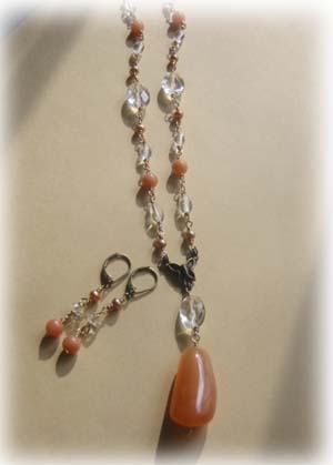 昨日作った物です。オレンジストーンのピアスとペンダントのセットです。初めてワイヤーをこういう風に使ったな~と思う位丸めてねじって,丸めてねじって・・・・をくり返しました。(石をつないでいるほとんどの金具は,全部自力で作った物です。)作り出すと,ハマってしまいどんどん作りたくなっちゃう。かなり面白いですね~夢中になって,指の先に力が入らなくなってしまいそうでしたがなんとか作りました。余りにも面白いので、ちょっと別の素材でも作ってみたくなりました。これは,先日ご紹介したYUKOさんの福袋の入っていた物です。kitは無駄がないから有り難いですね~ではまた。