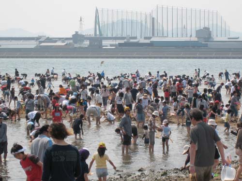 久々の日記更新です。帰省から帰宅してきたのでどどっと一気にしちゃいますので、良かったら見てくださいね。まずは3日の日記。旦那の実家に帰省しました。しかし、親族の結婚式があるというので留守のお宅に上がり込むのもなんですので「潮干狩り」に行ってきました。しかし、私は足を貝で切って流血するし子供たちは、潮が引く前にずぶぬれになってしまいやる気は壊滅状態。絶好の潮が引いた後の遠浅の潮干狩り会場は旦那のみが頑張ってました(爆朝から夕方まで海で遊べたのでそれはそれで良かったんですけどね(^^持って帰ったアサリはパスタに、お吸い物に、酒蒸しに・・・・してもまだ残ってますのでGW最終日に、バター炒めでもしようかと思ってます。人がやはりすごかったです。田舎なのにね。でわでは♪