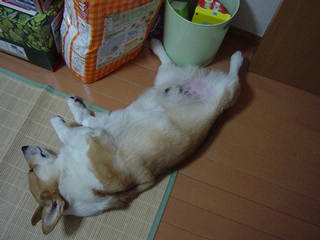で、この写真はその日のジョイです。車がある時はいいけど、オットが仕事で使ってるので歩いて病院へ行った日は帰ってくるとずーっとこんな感じ。薬でダルイんじゃなく、歩き疲れですね。結構な距離があるから。