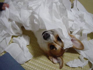 この写真は、ちょうど三年前・・・きょんたがティッシュを箱からガンガン出してしまったティッシュの海の中でおぼれてるジョイです。デジカメが行方不明になってしまい新しい写真が撮れず、だったので昔の写真をのっけてみました。