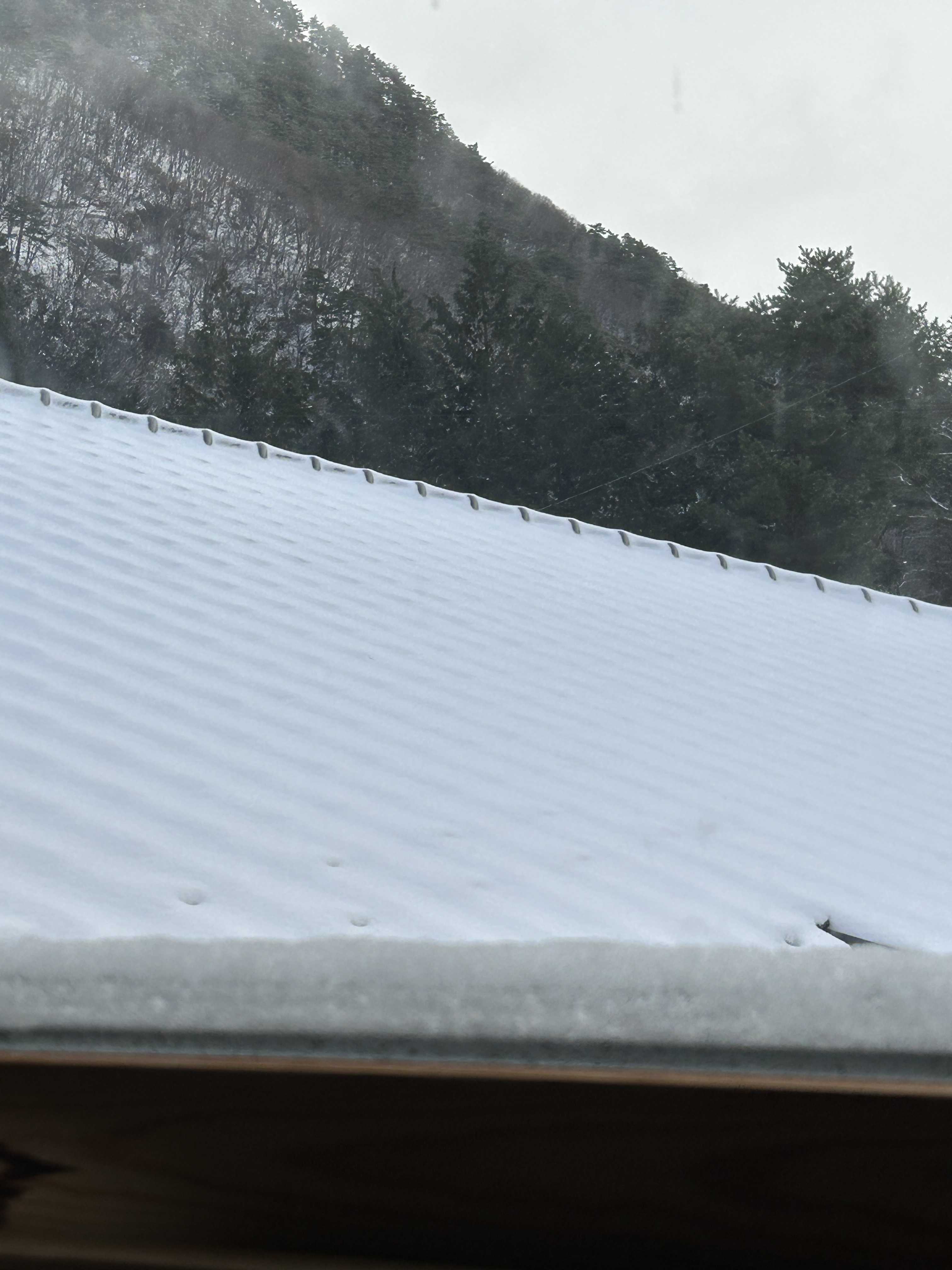 令和7年12月4日(木)、こんばんは!朝起きてカーテンを開けてみたら、離れの屋根に雪が…