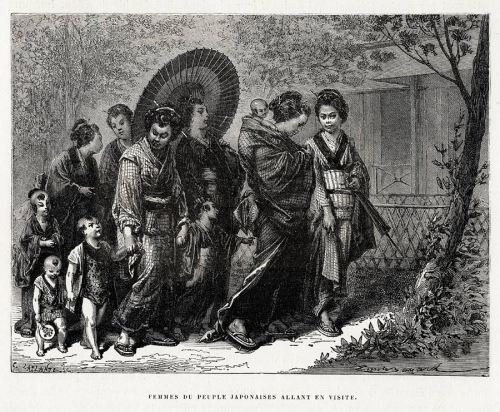 LE JAPON ILLUSTRE1870年 パリ アシエット社版画この銅版画は,1860年代当時の様子を描いています。クレポン氏がデッサンを起こし、パリのアシエット社が出版したものだそうです。明治維新のころですね。この庶民の女性たちが、ワイワイとどこに行くのか、楽しそうですが描いた人の目には、半分西洋人の姿が映っているらしくどこか、日本人らしくない(笑)そこがいい^^一番目についたのは左端にいる、小さな男の子の姿。この子の気持ちになってこの時代を感じてみるとお兄ちゃんに手をひかれ、おあかさんや、おばさん、隣家のおばさんたちといっしょにお出かけする、この日は、きっと特別な日だったんじゃないかな~小さな歩幅で歩くので、ついていくのがやっとかもしれないけど小さなソサエティの中に、こうやって入れてもらいながら、大きくなるんだね、僕♪グループというよりも「群れ」しかも、同種の「群れ」を感じ、これは、今も変わらないなあと思うわけです。先日、浦和の駅で、乗客みんなが何トンもある電車を押してホームと電車の間に挟まった女性を助けた感覚あれ群れとしての、暖かさに通じると思うのね。その元の気配が、このフランス人画家の作品の中に感じられた、朝でした♪今日は、アートヴィレッジのミーティングがこれからあるので気持ちがアートになってよかった^^この作品♪めるし♪