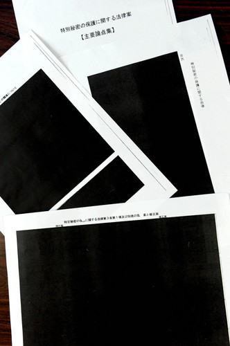 アメリカのケリー長官とヘーゲル氏が、千鳥ヶ淵の戦没者のグレーブヤードを訪れたと言う記事をアメリカとイギリスの報道で読んだのですが日本では大きくとりあげられていなかったようですね。10月3日に、日本の外務大臣と軍事的結びつきを更に強めるために、4人でにこにこ握手をしている写真が出ていました。日本では、報道されているのかな~?アジアの隣国からの核攻撃に備えているそうです。けっこう、緊迫している感覚ありですが日本では、消費税の増税と、秘密伝え文ほぜん法(本当はそんな名前じゃないけど、一応そんな名前のような、法案のこと。今、たろうさんがキャラバンで伝え回っているあれです。)でついにここまで来たかという感じで、なんだか、正体表したな!もう、これが何なのか、ここまですれば、みんなわかるでしょ?的なものが出てきてしまってこの黒いところに手をあてて、サイキックたちが、なんて書いてあるのかを知るための仕事をはじめるんじゃないかと思うくらいの写真がアップされていたのをみつけました。ここんなに黒く塗りつぶしたものが開示ですって?に・・・日本語の意味がわからない。今年は、年頭から、分けのわからないことが平気で行われている感覚を自分の周囲にも感じていたのですがなんだか、ついに正体が見えてきた感じがします。これは、受け入れるな、認めるなという ドイツの戯曲作家 アルベルト ブレヒトの使った「異化効果」という手法そのものです。つまり、反発させて、本当のことを知らせるという、ナチスドイツ支配下での演劇のあり方と似ています。知らぬが仏を通す道が、目前に出来上がっている今。先人の知恵である「異化効果」に学ぶ必要ありと感じます。