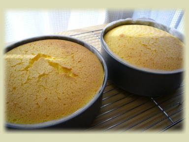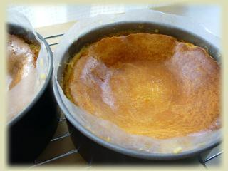 昨日 焼いたスフレなチーズケーキ♪有る分だけの材料で無理やり18cm@2台焼いたので少々 高さが…^^;それに~おもっきり ひび割れてるし…(^-^; っと言いますのは昨日 娘 午前保育。そこに またまた お友達から『今日 午前保育よね~午後からお暇!?』ってお誘いが…フム。AM11時…後10分もすればお迎えの時間ね。昼食を済ませた頃pm1時頃にお邪魔するお約束を…。1時間30分か…さて!?どうする!? ←先日同様^^;で、やっぱり真っ先に思いつくのは シャト○ーゼ!?(笑)でも…でも…どうする…どうする…っと言うコトで スフレなチーズケーキ♪についでに我が家の分も~って 卵5個しかなかったのに無理やり2台焼き(*≧m≦*)ププッで、材料 準備して気がついたのですがよく考えれば 焼くのに1時間程 かかるぞいっと^^;制限時間 いっぱいいっぱ~い気の利いたラッピングもなく ホカホカ…アチチなので…半分 箱のフタ開けて ダッシュ!!(笑) ちなみスフレなチーズケーキ 焼きたてよかワタシは冷やした方が好きですけど…(*^^*)ゞ*********************************************** ** 基本のレシピ **18cm 1台分【チーズ生地】*薄力粉 … 50g*卵黄 …L 3個*Milk … 100cc*生クリーム … 40cc*グラニュー糖 … 40g* クリームチーズ… 100g*バター … 20g*お好みで レモン汁【メレンゲ】*卵白 …L 3個分*グラニュー糖 … 40g◆チーズ生地@クリームチーズ*Milkを人肌強にレンジでチン♪ グラニュー糖を加え なめらか~になるまで混ぜる。@卵黄…生クリーム…溶かしバターを加えて なめらか~になるまで 混ぜる。@薄力粉をふるい入れ混ぜる。◆メレンゲ@ ハンドミキサー(低速)卵白のコシを切るように泡立てる。@グラニュー糖…1/3程を加え(中速or高速)泡立てる。@メレンゲがとろ~っとしてボウルの中を滑る程度になったら グラニュー糖1/3を加え高速で泡立てる@メレンゲ出来上がり終了手前で残りのグラニュー糖を加える。@低速にしてキメを整え メレンゲ終了。@チーズ生地のボウルにメレンゲ1/3程 加え ホイッパーで混ぜなじませる。@残りのメレンゲ…ヘラで泡を消さないように切るように混ぜる。@型に流し込んで 天板にお湯をはり蒸し焼き 160℃-30分 140-30分程 @焼きあがったら熱いうちにアプリコットジャムをそのままでもOKですが ブランデーとかラム酒 でゆるめたものを表面に塗る。 ↑の方が塗りやすいです。(お湯でゆるめてもOK!!)@冷めるまで放置◆型に生地を流し込む前に底にどこぞやのスフレチーズケーキみたいに お好みで レーズンをお好みで散りばめても♪******************************っと一応 ↑が基本のレシピなんですけど…このスフレのチーズケーキって~結構 どうにでもなる!?◆*薄力粉 … 50g を ホットケーキmixに置き換えて *グラニュー糖 … 40g を 20gでも OKです。◆私の使用してるクリームチーズは200g なので 半分の100gを使用してますが クリームチーズ100gでも~200gでも~250gでも 差ほど変わりません チーズの濃厚さはお好みで♪◆バターなしでも全然OKです。◆生クリームもなければ無いで OKです。 ◆焼成も~蒸し焼きは同じですが*130℃程で70分~90分でも←焼き色は薄かったです。*140℃…30分@180℃…20分でも↑この逆の 180℃…20分@140℃…30分でも焦がさず チャンと焼けてればOKみたいな…^^;ちなみに~膨れてきて Y(>_<、)Y ヒェェ!~っと思ったら私はオーブンの扉を開けてひび割れを…阻止!!↑気がついたら時は既に遅し!!ってコトが多いですけどね(^^ゞとにかく色々試しましたがなんだかコレ!!って言うのがない様な気がします。実にいい加減ですね(笑)