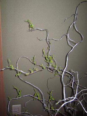 お正月に生けたもの・・・お花は枯れてしまったけれど、もったいなくてこの枝だけ残しておいた。すると!ある日!新芽が!!銀色にコーティングされた木の枝。息もできないだろうに・・・すごい生命力だまるでジュリーのよう・・・もっと、もっと、大きくなあ~れ