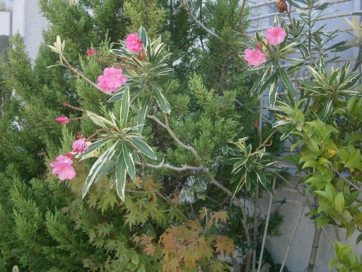 昨日のこと、営業回りで焼津市内を歩き回っていると、ふと赤い花が目に入ってきた(9/10撮影)。この季節、木に咲く赤い花といえばたいていサルスベリかキョウチクトウの花だ。 これはキョウチクトウだな。さすがにサルスベリやキョウチクトウは見飽きている。ここは写真を撮るほどのこともないだろう、と通り過ぎようとしたとき、ふと様子が違うことに気づいた。 あれ? 葉っぱに斑(ふ)が入っている!(もう1枚) キョウチクトウにも斑入りなんてあったのかな? 斑入りというのは、緑色の葉っぱの一部に黄色や白の模様が現れるもので、様々な遺伝的要因などによって葉緑素が不足することで発生するとされる。 模様の美しさを競って園芸的に作り出されることが多く、観葉植物などには様々な斑入りの品種がある。しかし、キョウチクトウにも斑入りの品種があるとは思わなかった。 調べてみると、やはり園芸品種で、流通量は少ないようだ。 たしかに、見慣れたキョウチクトウに比べると、斑入りの葉っぱは涼やかで見映えがいい。 しかし、斑入りというのは様々な原因で葉緑素が少なくなっている状態だ。 普通の葉っぱに比べると、光合成能力が低くなるため、あまり丈夫ではないという。 斑入りの涼やかな葉っぱというのは、病弱なはかない姿だったのだ。 私もかつては、事務所にこもりきりで日にも当たらず、真っ白な肌をしていたものだ。そんな状態を数十年続け、健康診断の結果はオールDランクの半病人だった。 ここ数年は、市内を自転車で走り回り、市外に出れば1日10km近くを歩き回るという生活を続けているため、健康面では20代の頃より良好かもしれない。 しかし、歩き回るだけではなかなか仕事はもらえず、懐具合は20代の貧乏時代と何ら変わっていない(泣)。