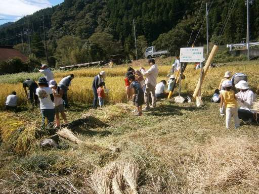 9月29日の土曜日は、清沢里の駅で行われた稲刈りに参加。清沢クラブのメンバーはそれぞれ予定があって都合がつかなかったため、クラブからは私一人の参加。自転車で1時間あまりの道のりだが、もう何回通ったか。楽な道のりではないが、さほど苦にもならなくなってきた。里の駅に到着すると、地元NPOフロンティア清沢のみなさん、一社一村運動で取り組んでいる静甲(株)のみなさんに加え、一般参加のみなさんなど、50人あまりが集まっている。今日の稲刈りは、この春に植えた100坪ほどの田んぼ。これだけの人数でこの面積なら、あっという間に終わっちゃうんじゃないか? 私は写真取材に徹していればいいだろう(9/29撮影)。まずは一面の頭を垂れる稲穂(1枚目左上)。手に手に鎌を持って稲刈り開始(同右上)。子供たちも稲刈りに挑戦(同左下)。1時間ほどで田んぼ1枚刈り上がり(同右下)。 これで取材おわり? (あと4枚) いやいや、そんな生やさしいものではなかった。取材だけのつもりが、子供たちまでが稲刈りしている姿を見て、私もやってみずには居られなかった。 なにしろ私もまだ、稲刈りをやったことがないのだ。鎌を借りて、草刈りの要領で稲の根本に鎌を振り下ろす ? あれ、切れないぞ。 2~3度鎌を振るったが、一向に稲は刈れない。鎌をよく見ると、ノコギリの刃のような切れ込みが入っている。そうか、ノコギリの要領で引っぱるんだ。 稲の根本に鎌をあて、鎌を引っぱると、みごとに刈り取れた。こうやって使うものなんだ! 隣でも女の子が「この鎌切れない」と音を上げている。「鎌を引っぱるんだよ」と教えてあげると、「あっ切れた」。お母さん方も「引っぱるんだ!」と、初めて知った様子。清沢のみなさんには初歩の初歩でしょうが、素人さんというのはこのように、鎌の使い方から教えてあげなければ分からないもんなんですよ。(かくいう私も知らなかったのだが) わずか1時間ほどの稲刈りだったが、腰をかがめた姿勢を続ける稲刈りはかなりきつい。休憩の合図があったときにはみなさん、本当にほっとしていたようだ。 さらに、刈り取った稲を藁で束ね、鉄パイプで組んだ稲干し台に吊してこの日の作業終了(2枚目)。こうやって1週間ほど天日干しにして、脱穀・精米にかけるのだが、この日はデモンストレーションとして、1週間ほど前に刈り取ってあった稲を使って子供たちに脱穀作業の体験もさせていた(3枚目)。足踏み脱穀機なんて、私もずいぶん昔に見た記憶はあるが、これまたなつかしい代物だ。 稲刈りが午前中に終わったので、私は清沢の家の畑のチェック。ソバは30~40cmに成長し、満開の花を咲かせている(4枚目)。レモン畑も、先週草刈りをしたばかのなのでまだ大丈夫のようだ。 後は、草ぼうぼうの家の脇の畑。落花生2株は元気だが、それ以外は雑草に覆い尽くされている。この周辺の草むしりを1時間ほど。午前中の稲刈りもあったので、もうくたくたで動けない。しばらく家の中で大の字になって休憩。 なんとか落ち着いたところで帰途についたが、体の節々が痛くてたまらない。帰路はほとんどが下り坂なので助かったが、往路・復路が逆だったら、その日のうちに帰ることはできないだろうな。