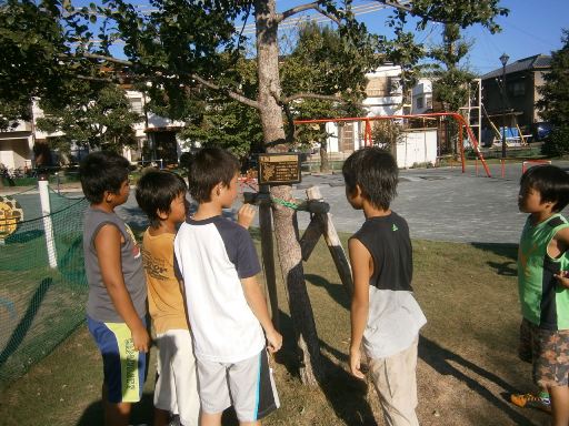 15日の土曜日は、静岡市から依頼された樹名板の設置に小鹿公園へ。ここは、市民が手作りの名札を設置してあるなど、樹木への関心が高い住民が多いようだ。私が樹名板を設置すると、サッカーをやっていた少年たちが集まってこれはなんの木だ、と樹名板を読み上げている(9/15撮影)。 この日の設置予定は45枚。午前中は事務所で下ごしらえ。現場で取り付けるばかりの状態にセッティングして段ボール一箱あまりの取り付け部品一式。自転車のカゴには入りきれず、一部を背負った上に段ボール箱を前カゴの上に載せ、危なっかしい格好で自転車に積み込む。こういう危ない真似はお薦めできないが、なにせ自転車でも片道30分はかかる場所。2往復もやっかいだとその格好で走りきった。50枚足らずなので設置には2時間もかからないだろうとたかをくくっていたが、やはり一人では効率が悪い。午後1時半に現場に到着し、取り付けが完了したのは午後5時近く。なんと3時間以上もかかってしまった。 こちらがこの公園の名物ため池を背景にしたソメイヨシノ(1枚目)。このため池の周囲にソメイヨシノが植えられているため、桜の季節には花見名所の一つになっている。 数年前にはこのため池全体にハスが生えていて、夏場にはハスの花が咲き誇っていたのだが、ある時一斉にハスが駆除されてしまった。病気でも発生したんだろうか? 私の楽しみの一つがなくなってしまった。 (あと2枚) 白状すると、冒頭の写真は私が頼んで集まってもらったやらせ写真だ。 しかし、私が取り付け作業をしている間、この子たちが樹名板を読み上げていたことは横目で見ていた。まったくの架空計上というわけではないのだ。そこで取り付けがひと段落したところで、「おーい君たち、写真を撮らせてくれないか」と呼びかけて集まってもらったという次第。 最後に、「ポーズをとってごらん」というと、ちょっと考えた挙げ句、「じゃああれやってみよう」(2枚目) どうもありがとうね。