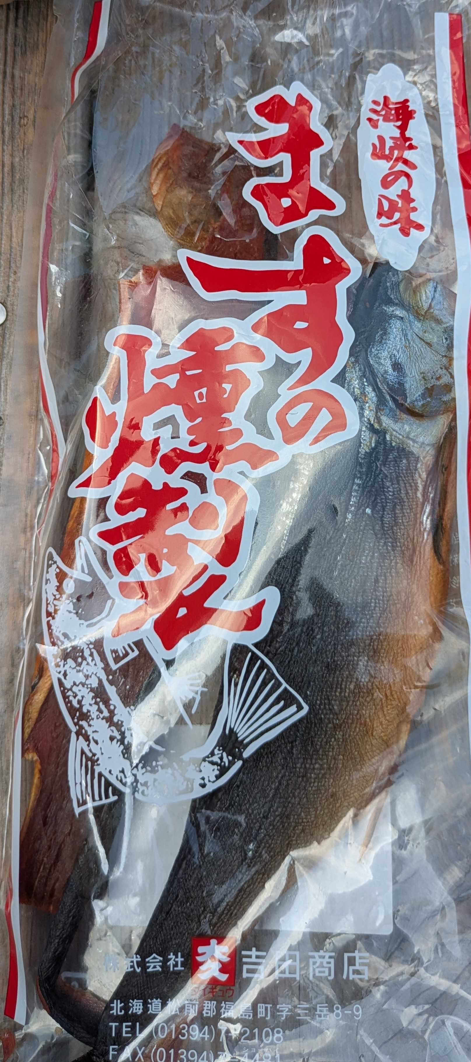 北海道特産の 鱒の燻製(1000円)鱒一匹分が燻製になっています ハサミでカットして細かくして酒の肴で食べました 美味しかったです